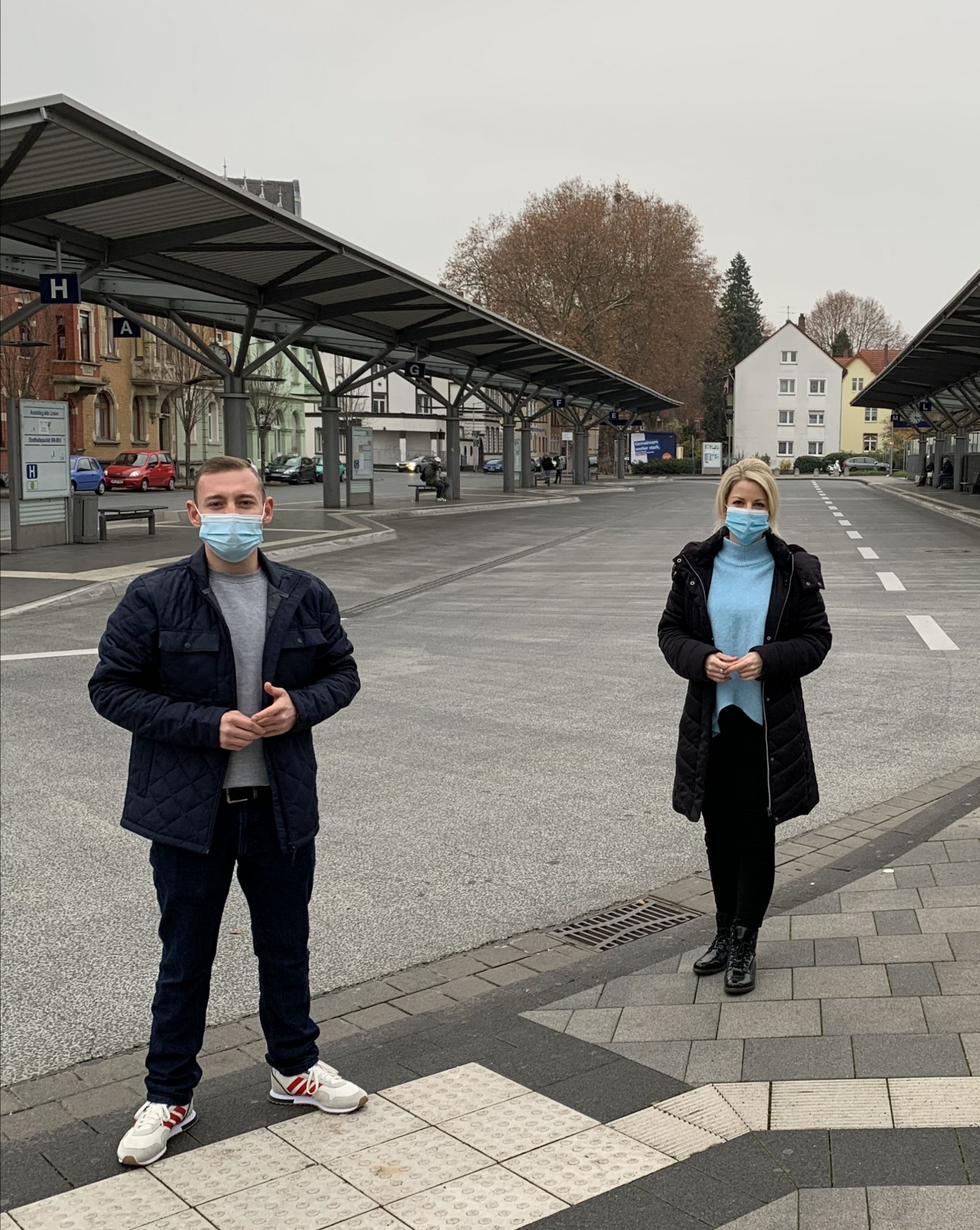 Foto: Der städtische Juso-Vorsitzende und Ratsmitglied Janick Helmut Schmitz macht sich gemeinsam mit der SPD-Landtagskandidatin Lana Horstmann am Neuwieder Busbahnhof ein Bild von der ÖPNV-Situation.